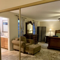 This is a spacious studio-sized unit, designed to provide both comfort & functionality. It comes furnished with a CA King bed, ensuring ultimate relaxation. two nightstands, a dresser, and a desk equipped with a printer. If desired, a small kitchenette can be added to the room, further enhancing its self-sufficiency. Natural lighting fills the room through three impressive windows. To ensure a comfortable environment throughout your stay, the bedroom is equipped with its own separate AC unit, & ceiling fan.